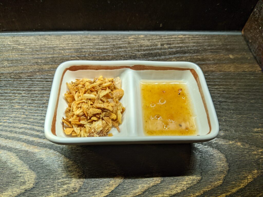 隨著麵附上來的還有這個,左邊是蒜酥,右邊是櫻花蝦油,店家說一開始建議先吃原味,吃到一半時可以加入蒜酥增加麵的口感,而加入櫻花蝦油湯則會有不同風味。
