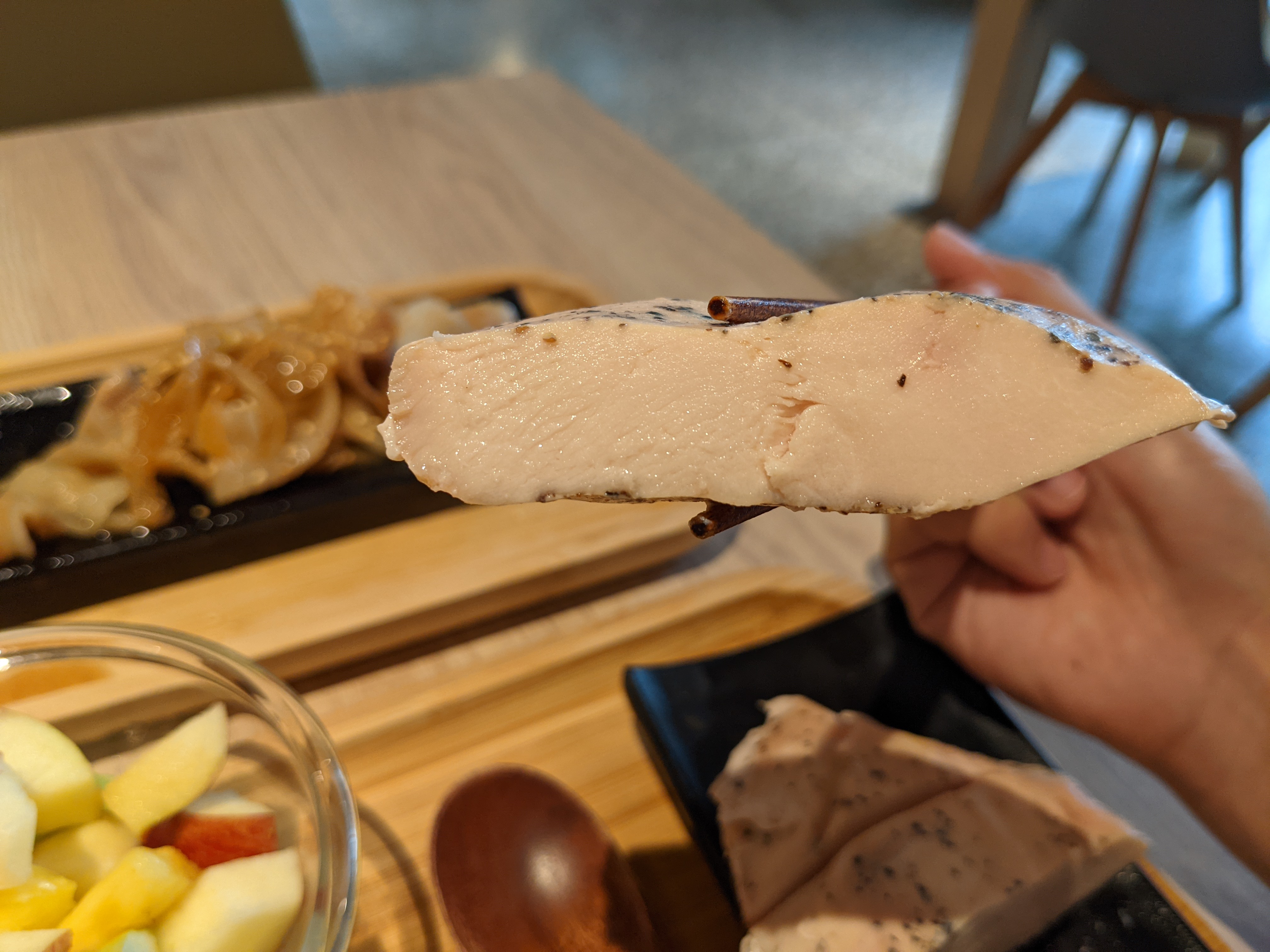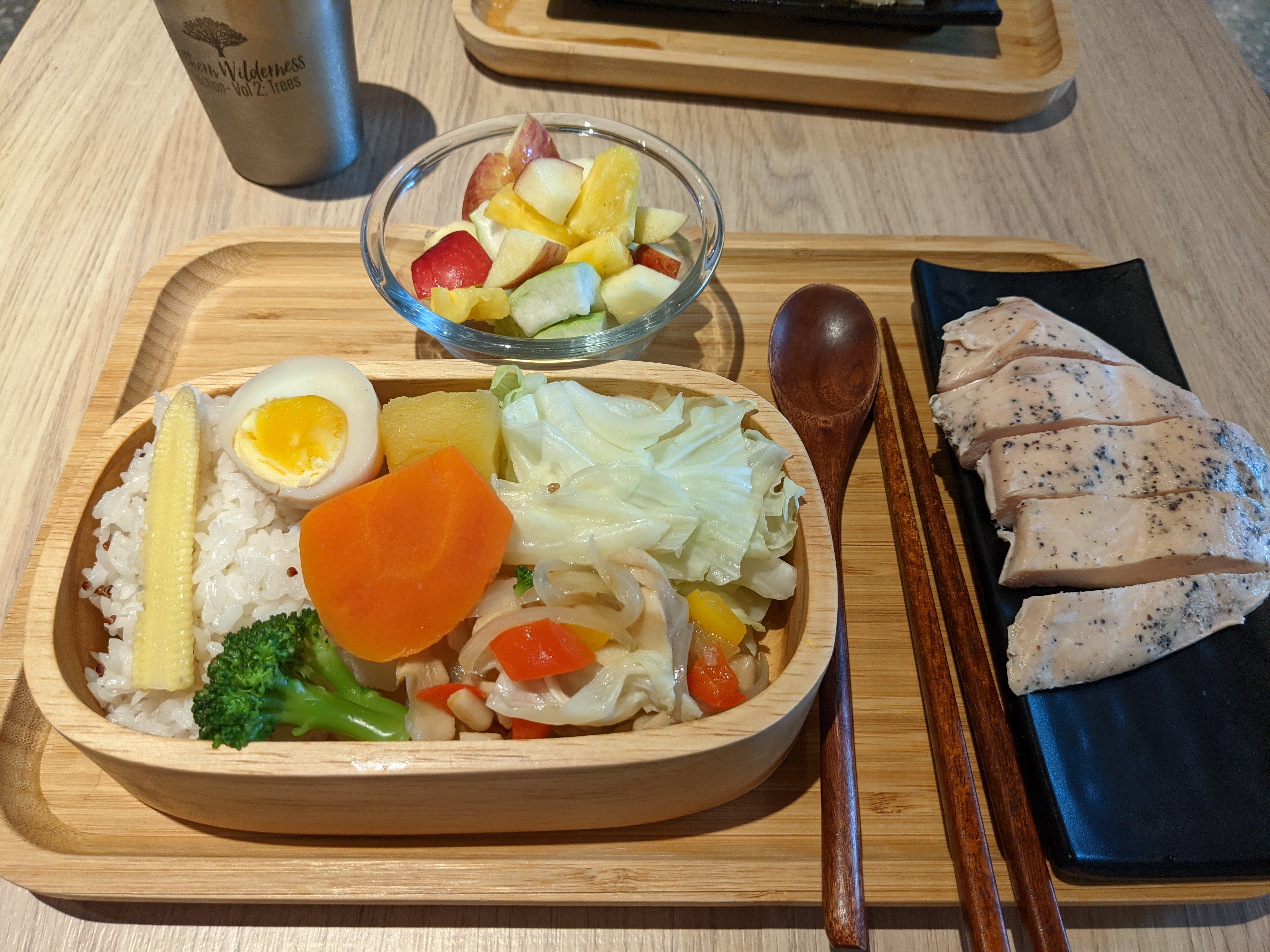 最後我改變主意,來試試看健康餐盒,因為肥宅我一定吃不飽,所以又額外點了豬五花跟水果盅,雞胸肉非常厚但咬起來不柴又很紮實,其它配料味道也處理得很好,對我而言是舒服又健康的一餐,可惜如果價錢可以再平價一點就好了,不過森 · 七七還是我在蘆洲想吃健康便當的首選哦!