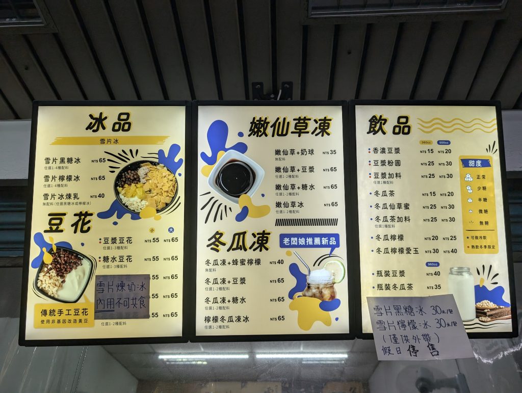 店內的雪片黑糖冰極具特色,別的地方可能吃不到,也相當美味,另外也有健康的豆漿豆花可以選擇。