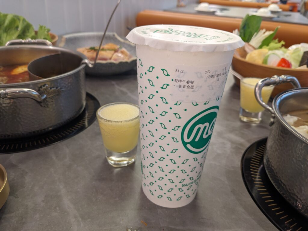 這裡主要的餐點都是套餐,都會附一杯手搖飲,不要看他只是火鍋店,飲料喝起來倒是一點都不馬虎,像我這次點的百香金橙,就真的超好喝~~
