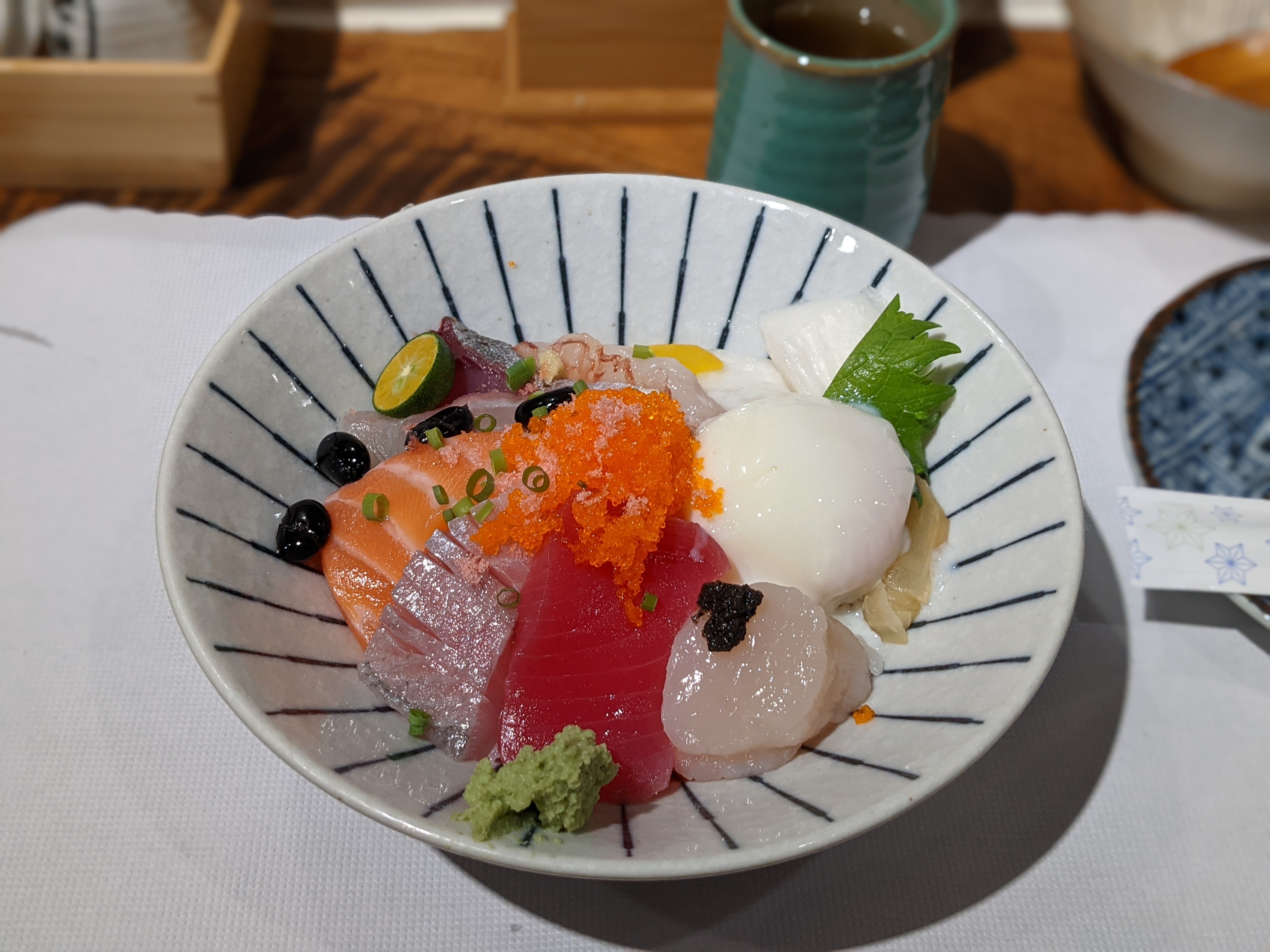 肥宅的綜合海鮮丼很快地就上桌了,看這滿滿的新鮮魚料,尤其是那個干貝配松露醬,很懷疑老闆這碗賣$360真的有賺錢嗎,只能說這些生魚片真的都很好吃又新鮮,最後再把溫泉蛋戳破吃完剩下的醋飯,真的有夠滿足!!