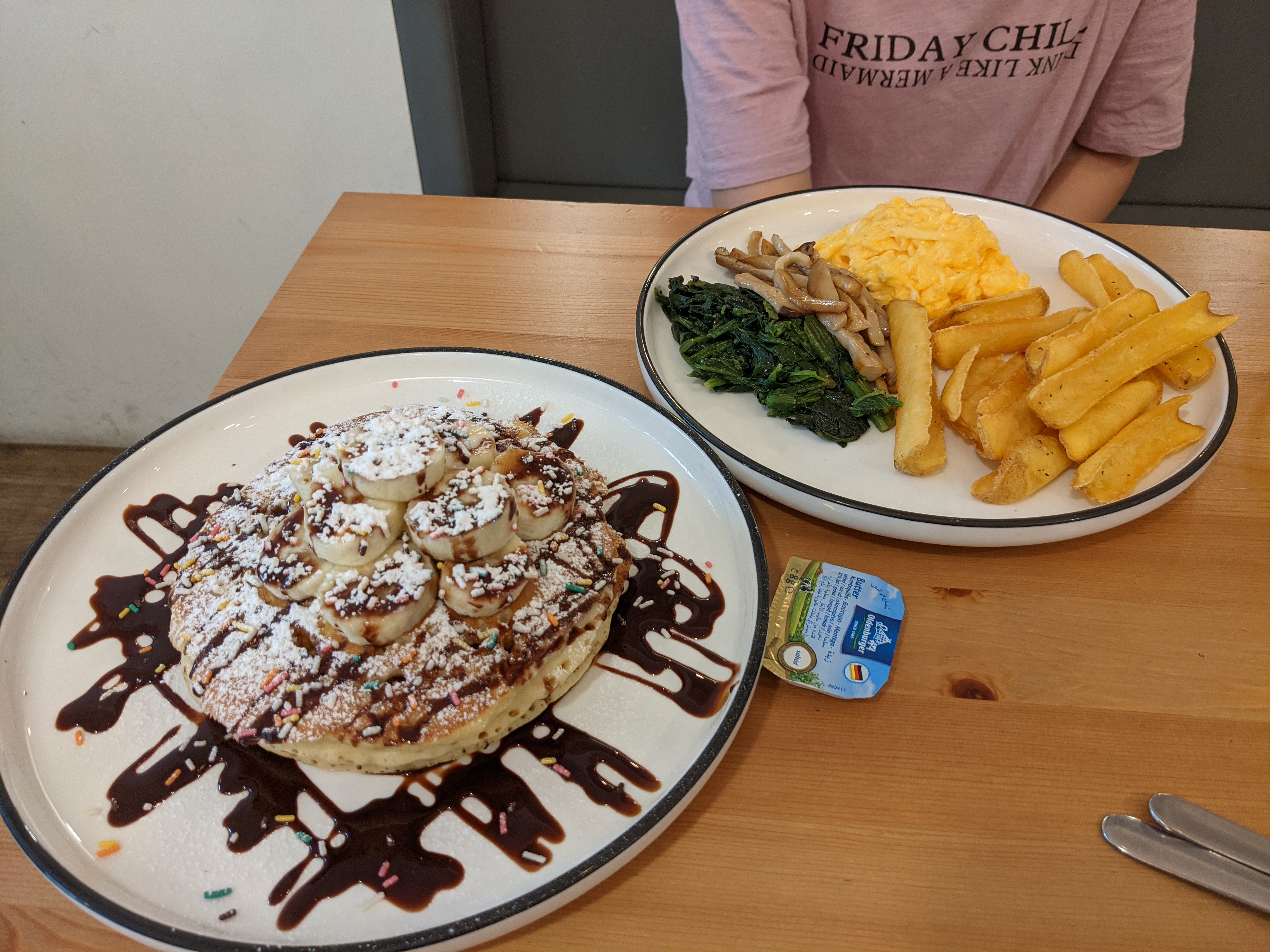 巧克力鬆餅/炒蛋/薯條/菠菜/杏鮑菇 $185