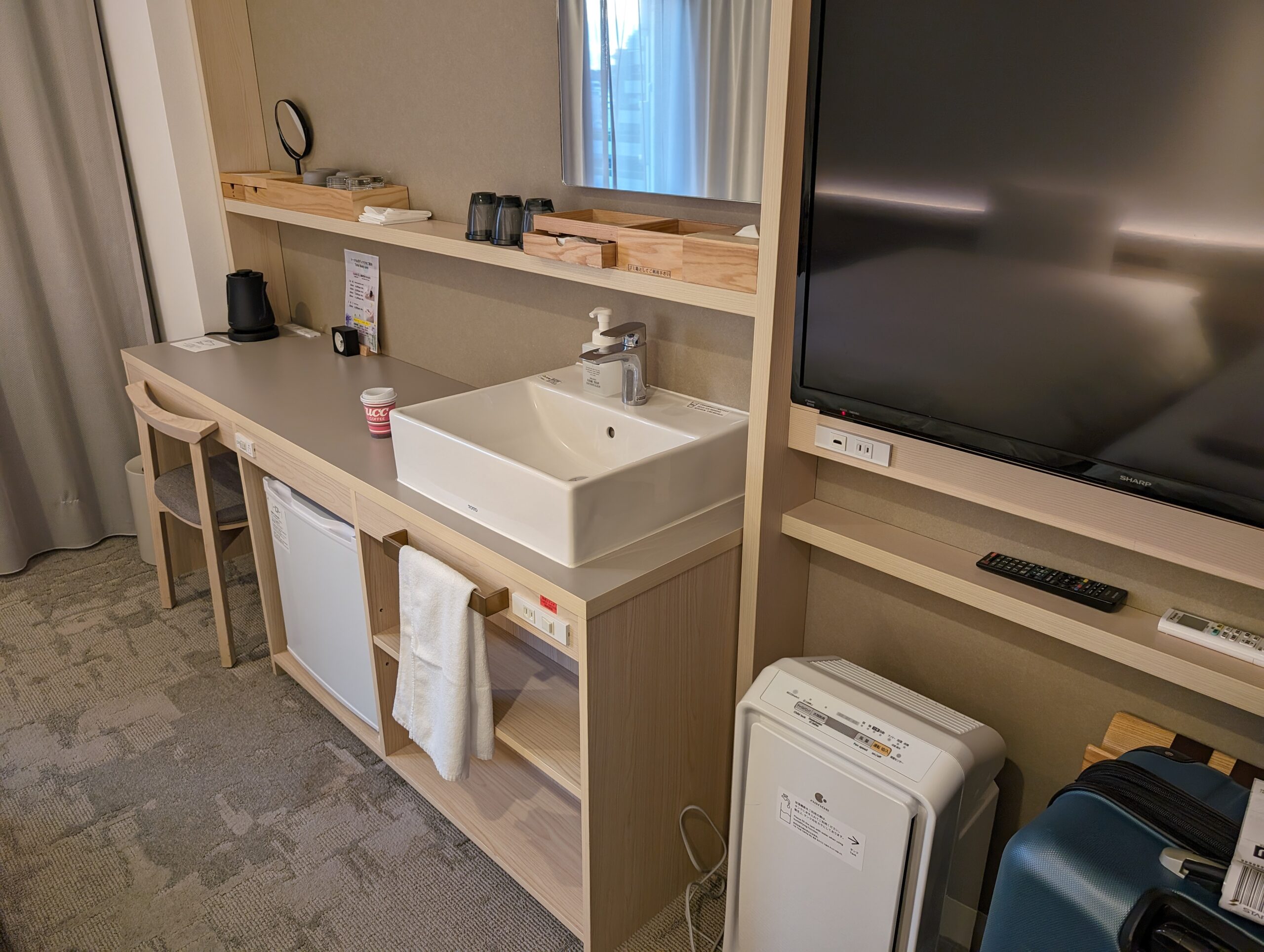 房間空間也算很大,我們兩個27吋行李箱都可以在走道上打開,而且很乾淨~