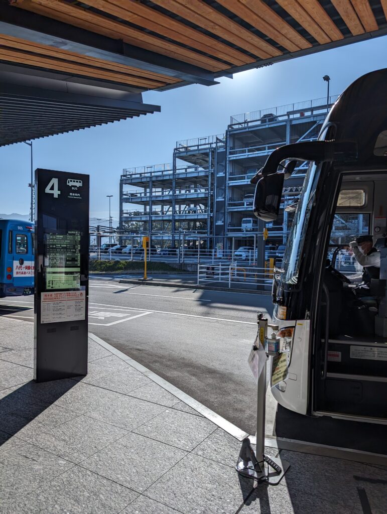 從熊本機場來的話可以從4號公車站牌搭到熊本櫻町巴士總站就可以了,車程大概40分鐘,下車大約走3分鐘就會到了。