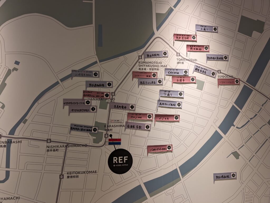 這間REF 熊本 by VESSEL HOTELS位於熊本最繁榮的商店街旁邊,樓下就是7-11,對面就是新開的超級大商場SAKURA MACHI 櫻町熊本,旁邊就是路面電車辛島町,也可以從熊本機場直接搭公車到達,旁邊就是有名的米其林豬排勝烈亭,還有黑亭拉麵,地點真的超級棒。