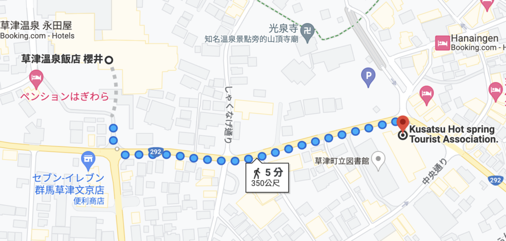 很快的就到了草津溫泉巴士站,從輕井澤搭巴士的也會在這個地方下車,不過如果從輕井澤來就不在JR PASS的涵蓋範圍囉。到的話第一件事情就是來去飯店放行李,櫻井在Google map顯示從巴士站走路只要5分鐘,但要注意的是這段路是上坡,拖著行李走會比較辛苦一點。