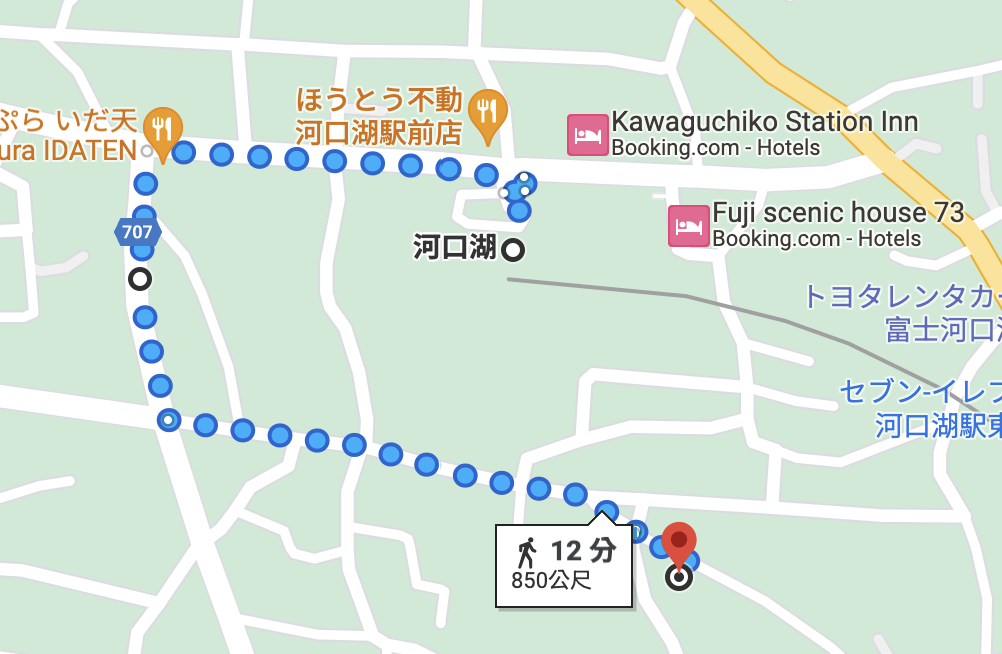 這次為了來看河口湖的楓葉迴廊,想說直接住在河口湖這裡,這樣隔天就有滿滿的一天可以好好逛河口湖附近的景點。因為不是自駕來到河口湖,所以在住宿選擇上比較困難,上網做了一下功課,大部分的人都是住在這邊的飯店(下圖紫色線),因為這邊有機會可以看到逆富士,但要運氣極好才可能看到,不過這邊離車站有一段距離,只能叫計程車,因為公車人會非常多,還要加一個行李箱幾乎不可能,所以這次選了這間 花の宿 夢富士, 比較靠近車站,行程上也比較靈活,而且早上醒來就能在庭院看到富士山(如果房型有QQ,下面會解釋),另外還有專門的拍照點哦~